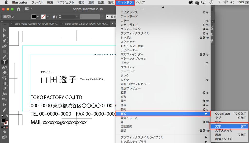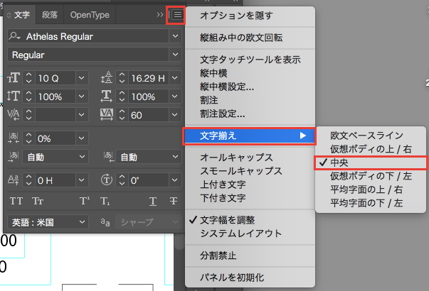 そして、[文字]パネルの右上[メニュー]をクリックして、[文字揃え]→[中央]を選択すると、「山田透子」と「Toko YAMADA」の文字が上下中央に揃います。