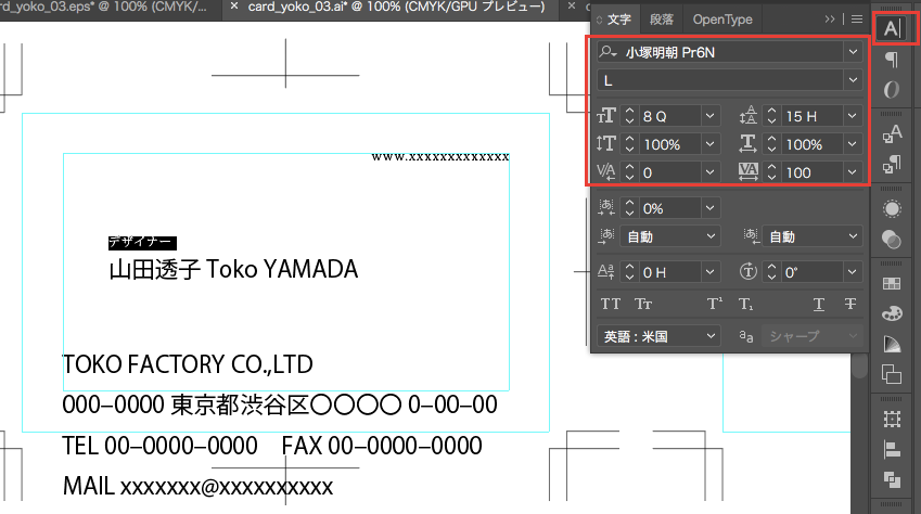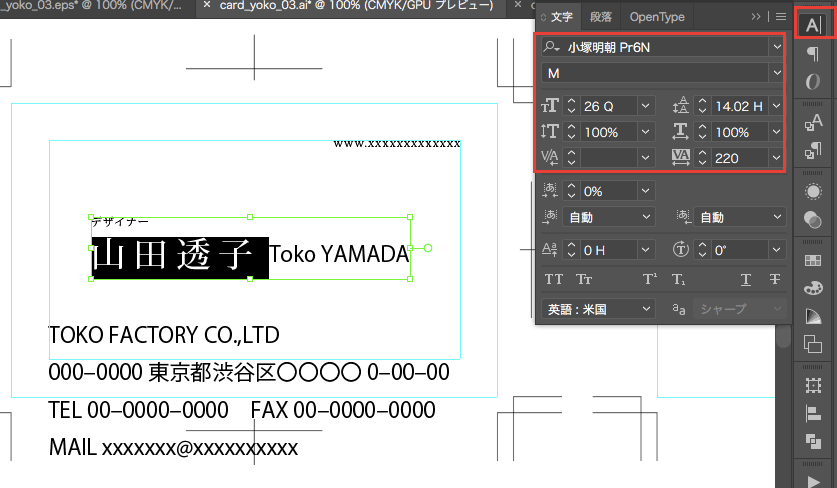 続いて、「Toko YAMADA」の文字を選択して、[フォントファミリ]細いセリフ書体、[フォントサイズ]10Q、[文字のトラッキング]60に設定します。