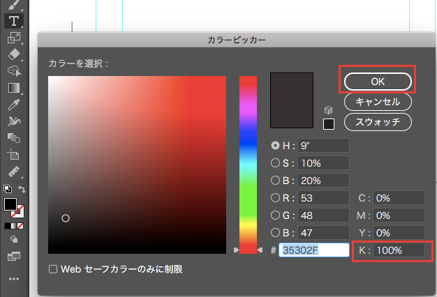 続いて、ツールボックスをダブルクリックして、[塗り]K:100、[線]なしを設定します。