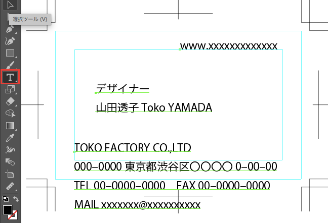 [文字]ツールを選択し、見本の位置でクリックして「TOKO FACTORY CO.,LTD」を入力します。続いて、ツールボックスをダブルクリックして、[塗り]K:100、[線]なしに設定します。