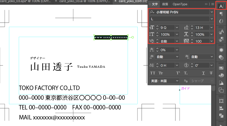 [文字]パネルが表示されたら、「www.xxxxxxxxxxxxx」の文字を選択して、[フォントファミリ]細いセリフ書体、[フォントサイズ]9Q、[行送り]13H、[文字のトラッキング]100に設定します。