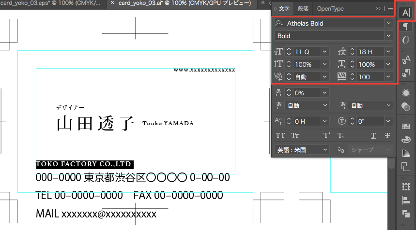 続いて、「TOKO FACTORY CO.,LTD」の文字を選択して、[フォントファミリ]太いサンセリフ書体、[フォントサイズ]11Q、[行送り]18H、[文字のトラッキング]100に設定します。