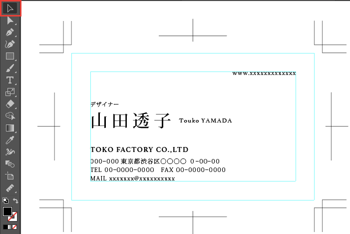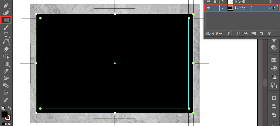 [長方形]ツールを選択して、左上のトンボ(トリムマーク)の角から、右下のトンボ(トリムマーク)の角までドラッグして長方形を作成します。