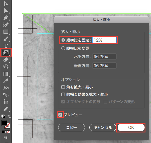大理石の画像がレイヤーに配置されたら、次に画像の大きさを調整します。[拡大・縮小]ツールをダブルクリックするとダイアログボックスが表示されるので、[縦横比を固定]の縮小率を設定します。そして、[プレビュー]ボタンにチェックを入れて大きさを確認して問題なければ[OK]ボタンをクリックします。