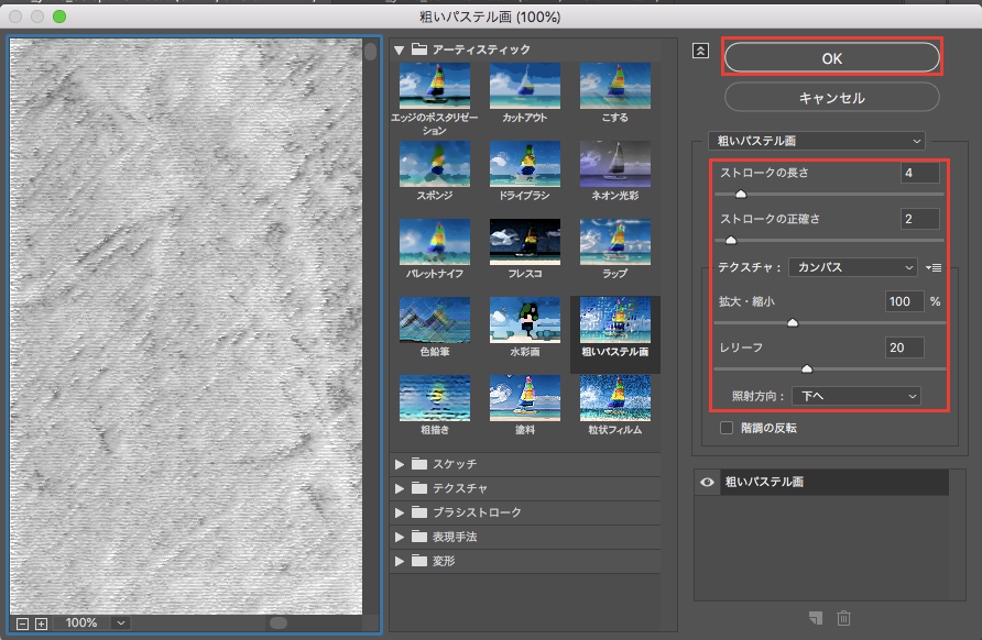 [ストロークの長さ:4]、[ストロークの正確さ:2]、[テクスチャ:カンバス]、[拡大・縮小:100%]、[レリーフ:20]、[照射方向:下]へを選択して[OK]ボタンをクリックします。