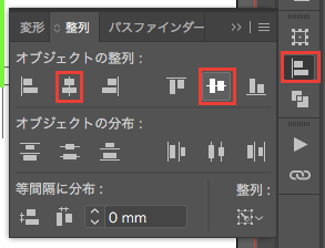 メニューバーの[ウィンドウ]→[整列]を選択すると、[整列]パネルが表示します。