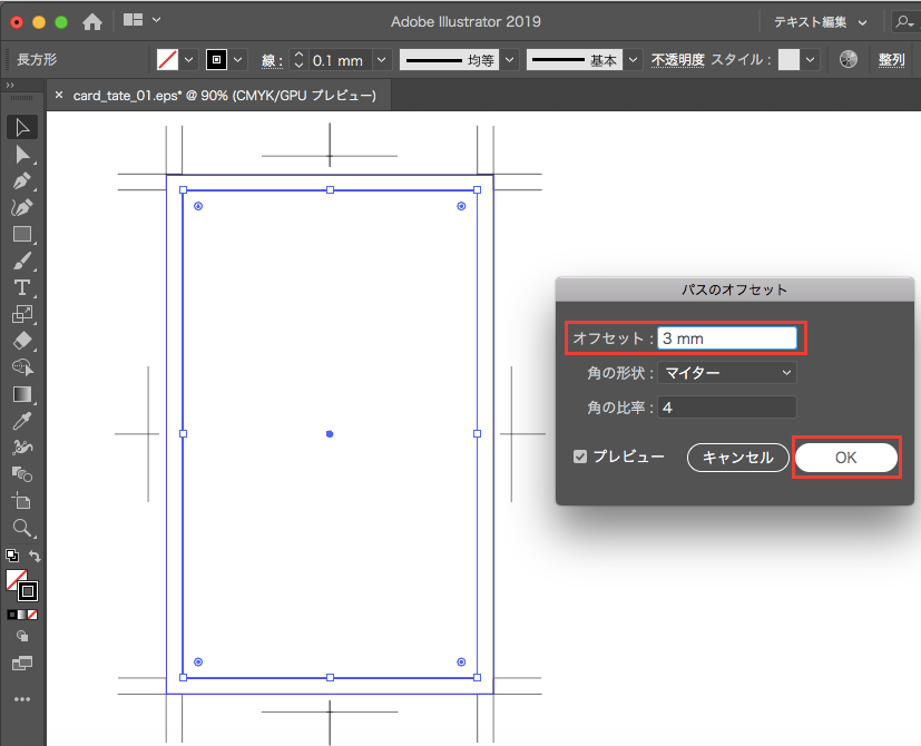 [パスのオフセット]のダイアログボックスが表示されたら、[オフセット]を3mmに設定し[OK]ボタンをクリックします。
